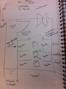 The basic restaurant layout. A little unusual by design, with the kitchen doors at the rear with the main entrance.