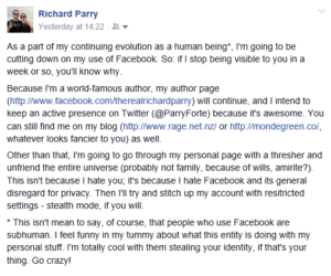 Death to FBPosted onJanuary 3, 2016AuthorRichard ParryLeave a commentDiscover more from ParrydoxSubscribe to get the latest posts sent to your email. Type your email… Subscribe