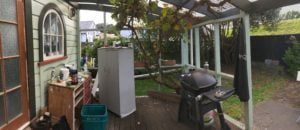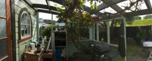 This was a kind of semi-enclosed veranda the previous owners of our villa put in. Every side was enclosed in cheap panelling: the wood untreated, the fibralite of the cheaper variety so that it’s not, as you can attest, see-through. Because it was a shitty place to hang out unless you were a spider or a cockroach, we made it worse by turning it into a universal storage room.