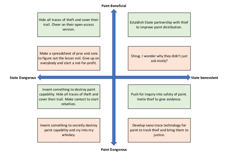Am I okay with my invention being stolen for Very Non-State Purposes? Depends on what the paint does, what kind of State we’re talking, and the intentions of the thief! Maybe we need a graph. Green is thief benevolent, red is thief dangerous. The lesson here is: don’t ask a policy geek this kind of question.