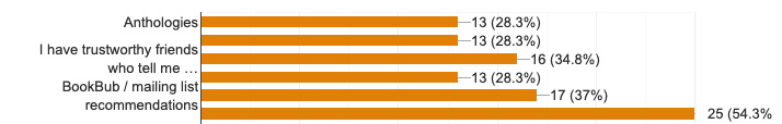 Also-boughts, anthologies, and 99c surprises rank equal at 28% each. What’s curious about this is anthologies used to be the gas that powered our empires, but less so now. It’s tricky to know why this is, although my hunch is the market’s been swamped by anthologies once someone said it was the best way to get your USA Today bestseller tag. There was a significant number of free-text answers (>10%) from people saying they browsed retailers, or Goodreads, looking through bestseller lists, reviews, and similar: social selling appears to still be a neat thing, but more time consuming to access.