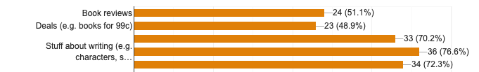 News at six: people like informative, useful, and entertaining content, rather than new release spam. If you’re an author running a site or mailing list, and only email people with new releases, this could be why your engagement is terribad. Speaking of relevant content, I asked what people thought was interesting: