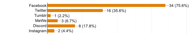 Yeah, okay, that’s pretty dire. 76% of people are on Facebook, with the closet competitor being Twitter at 36%. There’s some hope for the 18% of people using Discord, though, because that’s a real/intimate engagement platform. I’ve got some ideas and thoughts on where to take this which I’ll share soon, and is related to these two questions: