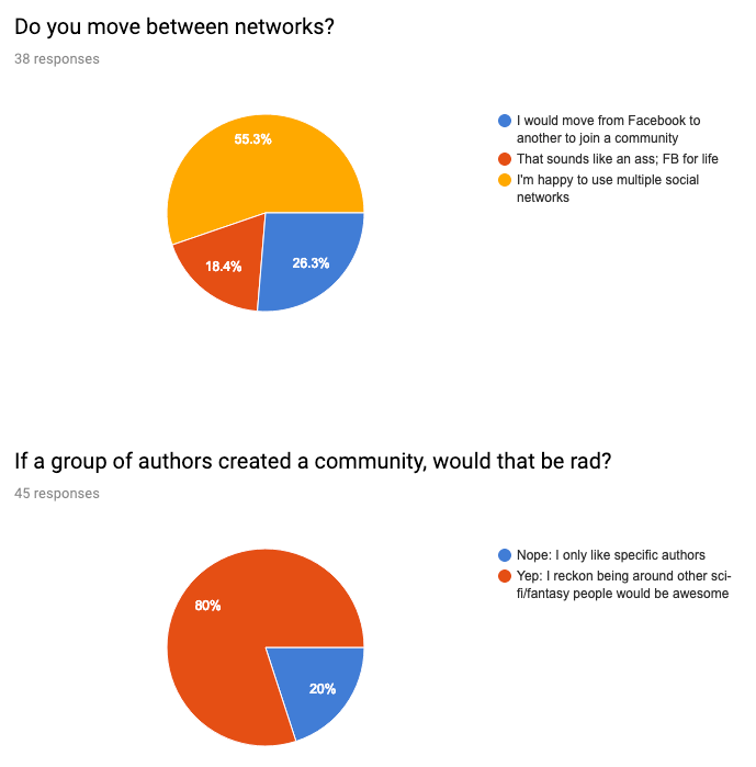 26% of people would outright migrate from Facebook (you are my heroes), and 55% of people would use Facebook alongside something else (still love you, but a little less). A staggering 80% of people would enjoy a collective made up of similar fans/authors in the genres they love.