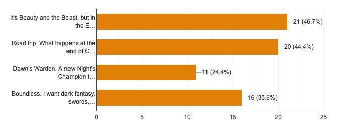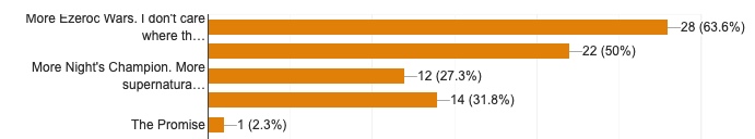 Most people want me to write Beauty and the Beast, but in space, so let’s do that. Tyche’s Lost is coming up next. It turns out I already completed the road trip story: mailing list fans got Tyche Forever on the house. Quite a few of you wanted this to be a trilogy, so I’m getting it edited by Tiffany, along with the next two, and releasing it to stores later this year. What’s cool is people’s desire for Boundless remains strong; it ranks a little higher in raw number power in this question (perhaps meaning new story universes are risky, but the idea has a high level of Rad™).