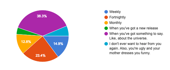 Most people, unsurprisingly, would prefer to hear from me when there’s something interesting to say. 6% of you are comedians (you know who you are, down there in the light blue). The really important number in this chart is in green: a mere 4% of people want to be emailed only when I have a new release.